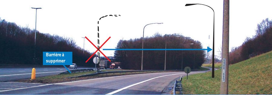 Candélabre accidenté pouvant être réimplanté dans la zone de moindre gravité, à droite |